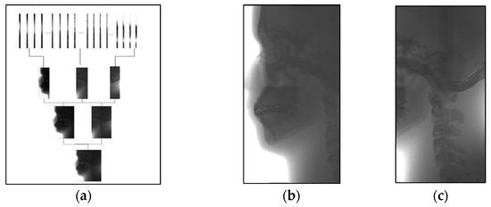 As shown in Figure 15a, the continuous stitching strategy was adopted in this paper to complete the stitching of 480 original sequence images. Figure 15b is an image of the anterior part of the skull obtained from serial image stitching, which is mainly used for the diagnosis and postoperative evaluation of oral deformity. Figure 15c is a stitching image of the posterior portion of the skull, which is used to diagnose the spine. Figure 15b,c obtained the final cranial lateral panoramic image of the oral cavity through a round of stitching.