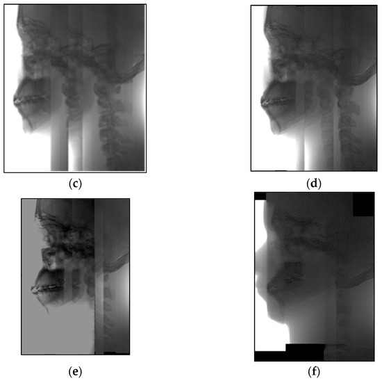 In order to verify the excellent ability of the algorithm in this paper to stitching images of lateral cranial sequences, we compared it with three different stitching methods. The stitching results of the algorithm in this paper are shown in Figure 16a; panoramic images have no stitching gaps and ghosts and the information remains intact during the stitching process. Ref. [38] uses SIFT to extract features for stitching, resulting in information loss in boneless areas of lateral cranial images, as shown in Figure 16b. Ref. [39] uses the combination of normalized cross-correlation and threshold method to stitching the image, but there was much false stitching and ghosting in the complex texture area, as shown in Figure 16c. Ref. [14] uses the strategy of SIFT combined with mutual information (SIFT-MI) to make up for the shortcoming of failing to extract feature points, however there are obvious ghosts and stitching gaps in some areas, as shown in Figure 16d. Ref. [40] uses an improved phase correlation (PC) algorithm and weighted blending to generate panoramic images, and there are a lot of information missing and stitching errors in the image, as shown in Figure 16e. Ref. [41] uses a new and improved algorithm based on the Accelerated KAZE (A-KAZE) Features, and there are significant stitching errors in the cervical stitching of the image, as shown in Figure 16f.