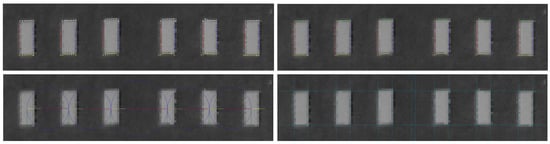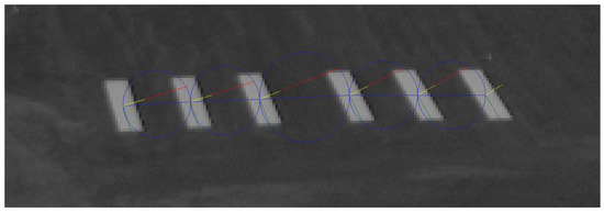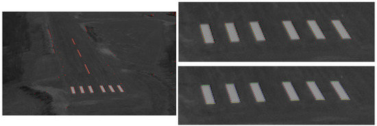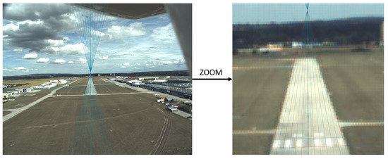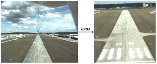 Threshold bars are transformed rectangles in the captured images. We assume that spatial order and distance/width ratio () of consecutive rectangles is similar to the top-view template (representation). It is true for possible approach trajectories towards the pattern from direction, in general, only the cross-ratio can be used which describes relation of four collinear points. The detection has two main stages: detection of possible transformed rectangles and then representation matching of the threshold marker. The representation consists of 4–16 rectangles with given distance/width ratios. At Septfonds airfield we have 2 × 3 bars, the width of a bar is 1.5 m and the distance between the the two bars in the middle is 6 m while the other bars have 4.5 m separation. An example image and the corresponding detection are presented in Figure 2. Optics can have radial distortion; however, in the case of small distortion, the detection of short line features is possible without undistortion of the image. Undistortion is applied after the runway marker representation matching inside the ROI of the detected threshold bar area.