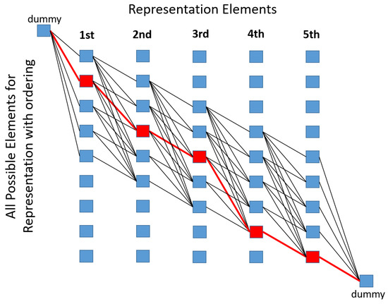 Dummy nodes are connected to all possible first and last candidates with zero cost edges. In the example of Figure 4, we have 5 representation elements (missing elements are not allowed) in the representation, thus the last 4 candidates cannot be the first element, similarly the first 4 candidates cannot be chosen as the last element. The candidates are ordered, which means that only candidates with higher indices are available as a successor. Succession costs (last 3 entries of the cost function list) are weights on the edges between the candidates, while candidates also have their own goodness (first two entries of the cost function list). The solution is the minimal cost route between the two dummy nodes which can be obtained by the Dijkstra algorithm.