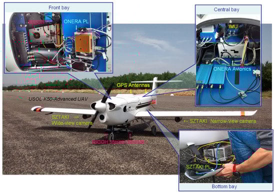 Our vision-based navigation sensor which is described in this paper (SZTAKI sensor) was a building block of a complex UAV system (Figure 7). It is designed for real flight validation of navigation and guidance performance recovery from sensor failures (e.g., degradation of GPS/SBAS or ILS) [5]. The experimental platform was equipped with an avionic (computer and navigation sensors: 9-axis IMU, GNSS, barometer, and pitot tube) developed by ONERA, a stereo-vision sensor of RICOH company, and SZTAKI sensor based on 2 different field-of-view (FOV) cameras. RICOH stereo and SZTAKI monocular sensors are devoted to runway relative navigation. Other navigation sensors (IMU, GNSS, and barometer) are used for ground truth collection. On-board emulated ILS and GNSS degradation models are applied to emulate failures and degradations in the guidance performance recovery tests where the independent optical sensors provided the necessary additional information. Stereo sensor was also used for obstacle detection on the runway. All the payloads were time-synchronized by the pulse per second (PPS) signal of the central GPS receiver. Information of vision-based sensors were processed in real-time and collected by ONERA payload for ground-station feedback and for the navigation filter [14].
