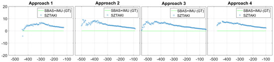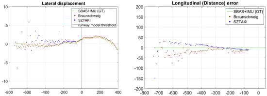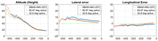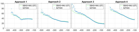 Altitude results are the most critical for safety because altitude is in close connection with height above the ground. Figure 18 presents the altitude measurement results and their errors. According to this comparison, we can conclude that threshold marker representation becomes comparable to runway model fit at 400 m and superior at 200 m with 63.35 degree optics, 1280 × 1024 image resolution, and 23 m runway width. The IMU-free method can be used within 600 m with threshold bar detection as initial guess for complete runway model fit. These results also demonstrate that vision-based navigation raw results can outperform GPS altitude precision (within 200 m) at the most critical phase of the approach. Table 2 shows the detailed comparison of SZTAKI and Braunschweig navigation results. GPS alone has meter range altitude errors while SBAS improves it to around 30 cm altitude errors, thus optical sensors are extremely useful at the end of the approach. Within 60 m longitudinal distance when the threshold marker is no longer visible, only the side lines and center line can be used for visual navigation which can provide only lateral and vertical measurements. C2Land vision-based vertical measurements indicate good performance within 50 m from threshold and during landing.