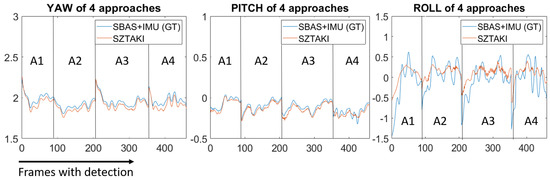 Homography of the threshold marker gives us a complete 6D relative pose of the camera from which 6D pose of the aircraft can be calculated directly. Figure 14 shows the euler angles of the aircraft during the four approaches. The yaw and pitch angles were precise with a bias, however, roll angle measurements could not follow fast oscillations. The engine of K50 has various shake frequencies (rotor rpm dependence), thus the vibration dumpers sometimes allow high-frequency shakes of the camera which can be also seen as small amplitude high frequency oscillations on the roll angle, but the large low-pass effect may also come from the dumpers, because the cameras were on the wings and roll of the UAV pushes the dumpers. Using dumpers is a trade-off because high-frequency shakes cause blur effect in the image which can prohibit detection and decrease precision of image features; however, dumpers may degrade the roll angle accuracy. In real-life experiments, the GT can also have problems, which cannot be completely excluded. Yaw bias is larger than a bias, which can come from the difference of on-ground extrinsic calibration compared to the in-flight situation. The possible other sources are the not completely planar threshold bar area, or an error in our measurement when we defined the 3D attitude of the plane of the threshold area. It does not come from the image processing, because it has no distance dependence.