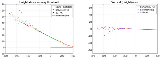 Altitude is the most important navigation data for the aircraft. Braunschweig measurements start at 2000 m with IR-based detections. The SZTAKI sensor first detection is at 718 m and become fully continuous from 434 m. The sign of vertical error is defined by the downward looking axis of the runway frame.