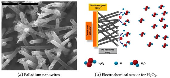 Electrochemical hydrogen peroxide (HO) sensor based on palladium nanowires (PdNWs). (a) SEM micrograph of the PdNWs electrode, (b) basic diagram of the sensor operation. With permission from [].