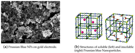Characteristics of Prussian blue nanoparticles (PBNPs). (a) SEM micrograph of the PBNPs deposited by drop casting over an electrode; (b) Prussian blue crystalline structure. With permission from [].