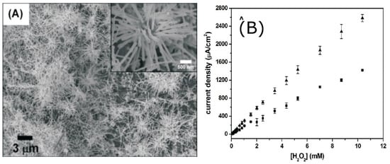 (A) SEM image of Ag urchin-like NWs on an SPC electrode (inset: enlarged view of a single cluster of urchin-like Ag NWs; (B) calibration curves of amperometric tests. Adapted with permission from [].
