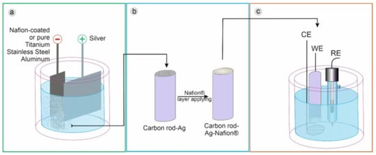 A general scheme for the synthesis of silver particles (a), their immobilization on the carbon rod electrode (b), and electrode utilization as a HO sensor (c). With permission from [].