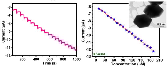 Chrono–amperometric response (left) of N-Co-MOF/GCE for the successive addition of 10 M of HO in 0.1 M PBS (pH = 7) under constant stirring, −0.35 V. To the (right), the figure shows the change in current at different concentrations of HO, the inset shows a TEM image of the Nitrogen-enriched MOF. Adapted with permission from [].