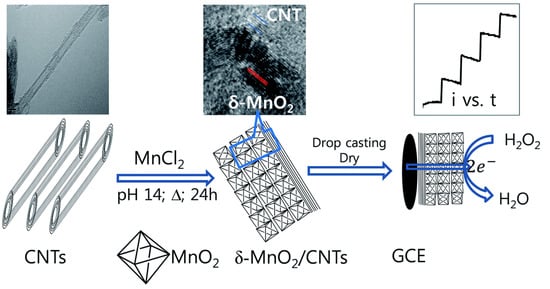 - Begum, H.; Ahmed, M.S.; Jeon, S. A novel δ-MnO2 with carbon nanotubes nanocomposite as an enzyme-free sensor for hydrogen peroxide electrosensing. RSC Adv. 2016, 6, 50572–50580. [Google Scholar] [CrossRef]