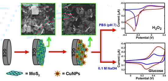 Molybdenum disulfide (MoS) has a sandwich structure of three hexagonal atomic layers (S–Mo–S). Strong covalent bonding among atoms enables the formation of 2D layers, with the layers loosely bound to each other via weak van der Waals interactions []. The anisotropic structure of MoS leads to significant anisotropy in electrical conductivity. This material is used as lubricant and catalyst for reactions like hydrodesulfurization []. This material has the particularity of having a similar structure as graphene and therefore it has been employed in the nanoelectronics fields []. One of its best features for electronics is the high on-off ratio, which is comparable to the graphene nanoribbons one. Moreover, the MoS structural properties allows ionic intercalation between layers which is desirable for electrochemical sensors because it significantly facilitates electron transfer. Lin et al. [] constructed a 3D nano-flower-like Cu/multi-layer molybdenum disulfide composite (CuNFs/MoS) modified glassy carbon electrode to achieve a non-enzymatic sensor for HO (Figure 8). Linear ranges were obtained between 0.04–1.88 M and 1.88–35.6 M for HO. LOD was 0.021 M.