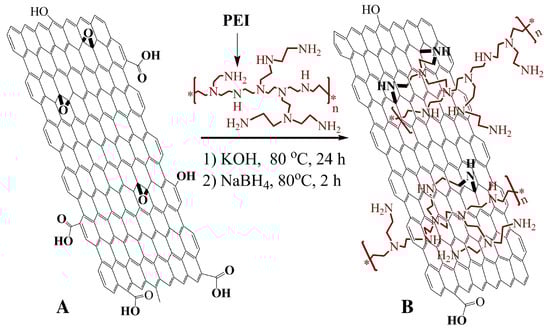 Polyethyleneimine (PEI) is a water soluble polymer with amine groups. Due to its active amine groups, PEI can react with other materials with some certain active groups, such as carboxyl or epoxy groups. Shan et al. [] took advantage of these active groups to covalently graft graphene sheets via the nucleophilic ring-opening reaction between the amine groups in PEI and epoxy groups of graphene oxide (Figure 12). The sensor was then constructed by a layer-by-layer complexation method by taking advantage of the difference in electrical charge of the materials. Very much like drop cast, this construction method is simple and easy to be performed. The resulting sensing performance is shown in Figure 13.