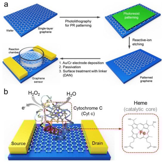 - Lee, S.H.; Kim, K.H.; Seo, S.E.; il Kim, M.; Park, S.J.; Kwon, O.S. Cytochrome C-decorated graphene field-effect transistor for highly sensitive hydrogen peroxide detection. J. Ind. Eng. Chem. 2020, 83, 29–34. [Google Scholar] [CrossRef]