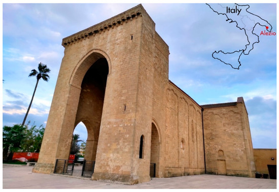 The church of Santa Maria della Lizza in Alezio (Figure 1) is a very important example of late medieval religious architecture in the Apulia region in southern Italy. Located on the western side of the Salento peninsula about 6.5 km east of Gallipoli, with its high turreted pronaos it dominates a vast territory projected onto the Ionian Sea (Figure 2). The building is linked to the ancient cult of the Assumption of Mary, defined as “della Lizza” or “di Alizza” because it was built on the homonymous hill, characterized by a toponym that derives from the ancient Messapian-Roman settlement of Aletium, in which the Lizza hill was one of the most important sectors [1].
