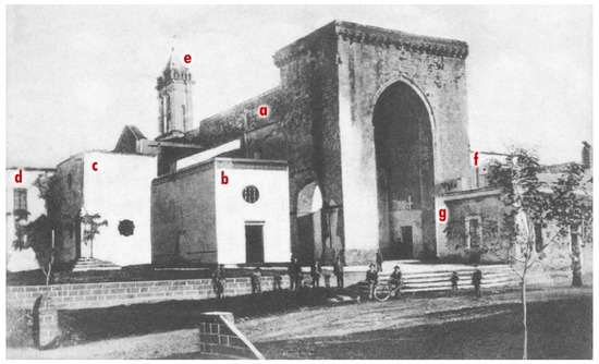Church of Santa Maria della Lizza in Alezio (Lecce, Italy). Photographic document from the early 20th century that still shows: the masonry vaults (a), the small northern nave (b), the sacristy (c), the bishop’s palace (d), the bell tower (e), the Congrega’s house (f) and buildings leaning against the pronaos (g) (after [6]).