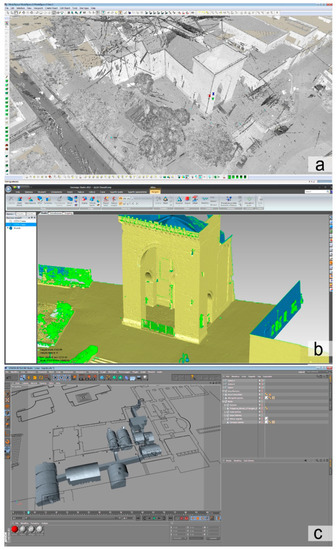 Screenshot of the survey campaign data processing: (a) the 1.3 billion point cloud; (b) the polygonal surface processed from the point cloud; (c) the model optimization and the creation of plans, sections and renderings.