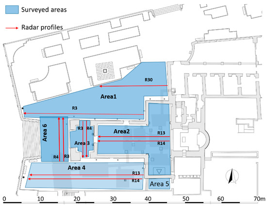 A GPR survey was performed on six areas labelled Area 1-Area 6, respectively (Figure 5): Area 1 is an open space immediately to the north of the church, corresponding to the demolished northern nave and old sacristy (see Section 2 above); Area 2 is inside the church, including the transept and the nave; Area 3 is inside the pronaos; Area 4 is an open space immediately south of the pronaos and the nave, corresponding to the demolished Congrega’s house (see above paragraph 2); Area 5 is a small open space south of the transept; Area 6 is an open space in front of the pronaos, partially corresponding with the northern sector of the demolished housing (see above paragraph 2). For the GPR measurements the georadar Ris Hi-Mod was used. with the aim of obtaining a good compromise between resolution and depth of investigation, the dual band antenna was used with central band frequencies equal to 200 and 600 MHz. GPR data were acquired with parallel profiles spaced 25 cm. Successively data were processed by the follow steps: (i) zero timing; (ii) background removal filter [12]; (iii) gain variable versus depth [13]; (iv) Kirchoff migration [13]. For this last step the electromagnetic wave propagation velocity of 0.11 m/ns, evaluated from diffraction hyperbolas [13], was used.