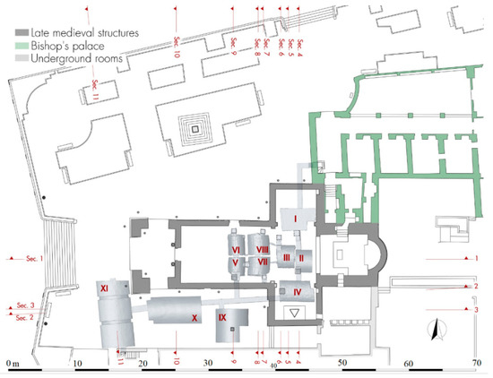 By analyzing the 3D model of the underground sector, it is possible to clearly understand the size of the individual rooms, their location, the levels and the path of the modern corridors created during the 1959–1960 restorations to provide a tourist visit route. The underground rooms are accessible by a staircase placed in the entrance hall of the bishop’s palace, which leads into a passage 70 cm wide and 2.60 m height. The corridor, after a first stretch to west direction, turns 90° to the south, passes the foundations in the north wall of the transept and lead to the first series of four funerary cells placed below the transept (Figure 6, I–IV).