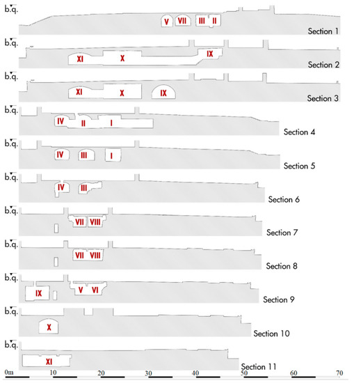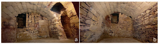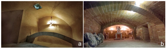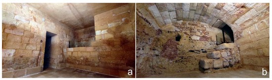 The last and largest room has a rectangular north-south oriented plan (10.00 × 4.90 m) and a depressed barrel vault reinforced by two arches 50 cm wide in the middle part (Figure 6, XI). The longitudinal axis is parallel to the western side of the Congrega’s sepulchral cell and it is likely that the houses once close to the pronaos had the same alignment, in order to not unload the weight on the vault (Figure 11b). The memoirs describe this underground place as cool and dry and used for the storage of grain and other provisions needed by the religious during their summer holidays in Alezio.