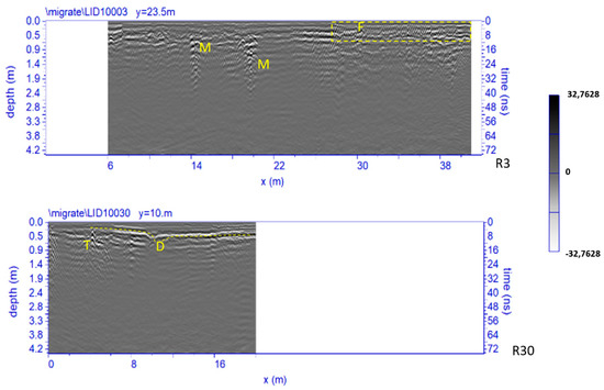 Figure 13 shows two processed radar sections related to Area 1. Four significant anomalies, labelled D, F, M and D are clearly visible. The anomaly F, inside the dashed yellow box, has a typical shape of small hyperbolas probably due to the presence of a metal reinforcement (electro-welded mesh) of the paving; the anomalies M at a depth between 0.5 m and 1.0 m are probably related to the presence of walls; anomaly T at a depth between 0.2 m and 0.3 m is probably related to the presence of pipes.