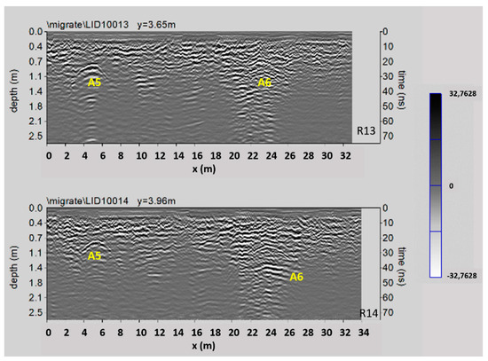 Figure 16 shows two processed radar sections related to Area 4. Here the reflected events at a depth between 0.5 m and 1.0 m (indicated with A5 and A6) are visible. They are probably relating to the presence of the already known parts of the underground rooms IX and X (see Section 3 above).