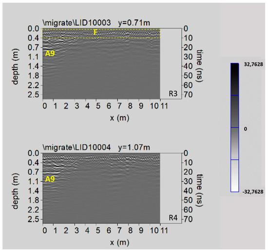 Figure 17 shows two processed radar sections related to Area 6. Here some reflected events, indicated by F within the dashed yellow box, are related to the presence of a metal reinforcement (electro-welded mesh) of the paving; other reflected events at depth between 0.7 m and 1.1 m (labelled A9) probably related to the presence of the northern part of the already known crypt XI (see above paragraph 2).