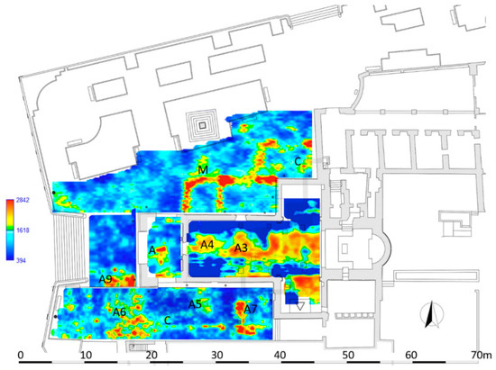 In the time slice related to the Area 4 (Figure 18), ranging from 0.8 m to 0.9 m depth, the anomalies A5, A6 and A7 confirm the well-known sector of the system of crypts; specifically, the anomalies A5 and A6 correspond to the rooms IX and X, while anomaly A7 is related to the well-known corridor that connects these rooms to the other crypts. Furthermore, the anomaly labelled C is visible in the same time slice and I related to the southern wall of the demolished Congrega’s house.