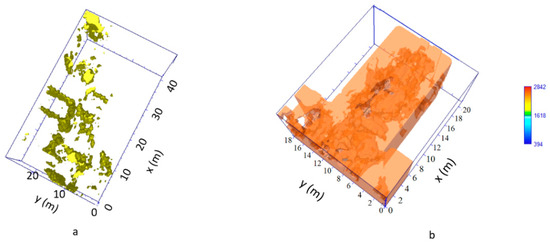 The 3D representation of the underground anomalies in the Areas 1 (a) and 4 (b).