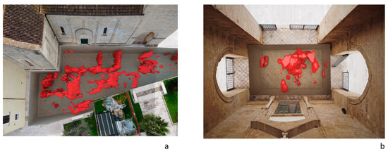 The created iso-surfaces volume (Figure 19 and Figure 20) was exported in a 3D ascii files in order to be merged with the polygonal surfaces obtained with the laser scanner data. Here is possible to insert the GPR iso-surfaces volume at the exact depth. In this way a sort of virtual excavation is obtained in which the georadar anomalies are positioned in the exact spatial position (Figure 21a,b) and allow to compare the known structures with those detected by the geophysical data allowing to get a relationship between the visible and the not visible.