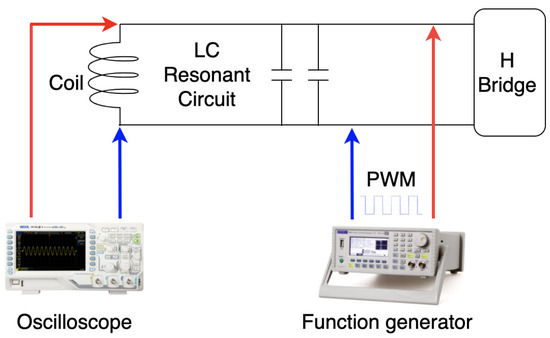 The coils are the most critical component in magnetic field generating (transmitter antenna) and strength sensing (receiver antenna), thus we have put a lot of effort into the coils’ design. Figure 1 shows the development history of the transmitter coils, which work as the magnetic field generator in a resonant circuit. All transmitter coils are manually twined with painted copper wires (0.8 mm in diameter) on the 3D-printed frame structures. The coil’s inductance value is calculated in a resonant circuit with the help of the function generator and the oscilloscope, as Figure 2 depicts. By triggering the resonant circuit with the Pulse-width modulation (PWM) signal (with the sweeping test frequencies), the Pk-to-Pk voltage value on the coil will reach its highest when the sweeping frequencies come to the resonant one, and the inductance of the coil can be derived by the values of resonant capacitance and frequency. The H-Bridge is used to trigger the resonant circuit to generate the magnetic field during the practical applications and is disconnected while doing the coil calibration. Once we got all transmitter coils with the same inductance value, we calibrated the resonant capacitors until an LC resonant circuit with a resonant frequency of 20 kHz was achieved. The same method was also applied to the receiver coils. In the current hardware system, the LC resonant circuit at both transmitter and receiver sides is tuned with the resonant frequency of 20 kHz. As future work, the frequency could be enlarged to strengthen and broaden the magnetic field. To be noticed, the 20 kHz frequency is the resonant frequency of the LC circuit, which also means that the activated magnetic field occurs in space with the frequency of 20 kHz.