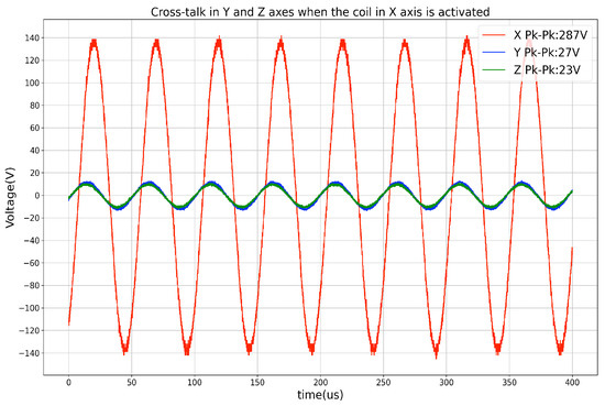 Cross-talk (represented by Peak-To-Peak voltage) on Y and Z axis while X axis being activated.