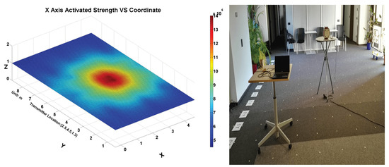 Figure 8 shows the distribution of magnetic field strength in the planar space. As described in the physical principle section, the strength signal is not a RF-like propagating wave, but a bubble-like field. Thus, the limitation in wave-based positioning approach, like refraction, reflection, and multi-path effects, does not exist in our magnetic field-based positioning approach. The data were collected while only the x-axis of a transmitter coil was activated. It is obvious from the figure that the magnetic field strength falls quickly with the rising distance. To be noticed, the strength depicted in the figures of this work is not the practical magnetic field strength with the unit of Tesla. Instead, we use the raw value from the analog to digital converter as the indirect indication of the strength for further evaluation, which is proved to be feasible as there a mathematical relationship between the practical strength and sampled rectified strength. However, the relationship is hard to derive with a back–forward inference (especially when there is a logarithmic amplifier in our hardware signal processing chain) and is not necessary regarding our final purpose of positioning.
