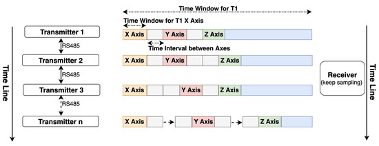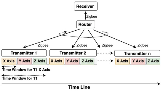 The Zigbee module broadcasts the identification of the next being activated transmitter. The magnetic field from each transmitter axis has the same time length, so the receiver “knows” whose magnetic field data is being sampled. As Figure 9 depicts, a router Zigbee broadcasts the ID of the transmitters with a certain interval, and the ID is listened to by all transmitters and the receiver. Once a transmitter gets its ID, it activates its axes to generate the magnetic fields sequentially. The receiver starts sampling for a certain time (slightly less than the Zigbee’s broadcast period) as long as an ID is received, then stops sampling and starts listening for the next ID. Within each axis’s time window, the receiver samples at least three times to get an averaged strength value. Finally, the receiver’s raw data include both the magnetic field strength information and the corresponding transmitter ID, as Figure 10 presents for an instance of two transmitters with Zigbee communication mechanism. To be noticed, the router Zigbee can be a separate module or any Zigbee module already mounted on any transmitters or the receiver.