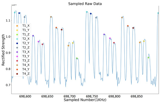 A second synchronization mechanism is based on the RS485 protocol, where each transmitter starts to sequentially activate its axes and generate three magnetic fields sequentially once a “start” order from the RS485 cable is received. After its time window, the transmitter gives a “start” order to its cascaded transmitter. This mechanism’s critical point is that the three sequentially activated magnetic fields’ intervals are different for each transmitter. This mechanism is used when doing the underwater positioning where Zigbee does not work. Unlike the Zigbee approach, where the current activated transmitter’s ID is directly supplied to the receiver, this RS485-based approach needs to obtain the ID information from the sampled strength data. As Figure 11 depicts, the receiver recognizes the current transmitter by the interval time between each sampled magnetic field strength data period. This approach requires a high sampling rate at the receiver side. Figure 12 gives a shot of the preprocessed data sampled at the receiver side after the synchronization, where four transmitters were deployed in the environment. The first step is to calculate the amplitude of raw data sensed by the receiver (as the receiver coil also has three axes). Then, a peak detection method is applied to pick up the strength data. The final step is to recognize the peaks’ belonging by observing the peaks’ time interval. Figure 13 shows the trend of the twelve magnetic fields strength from the four transmitters after synchronization and identification process on the raw data. Our next step is to abstract the distance information from the magnetic field strength data.