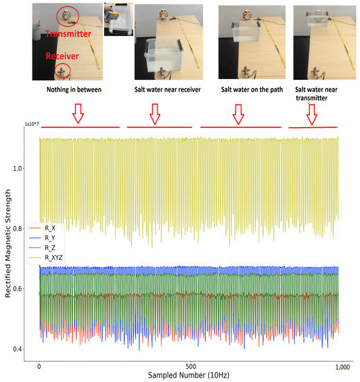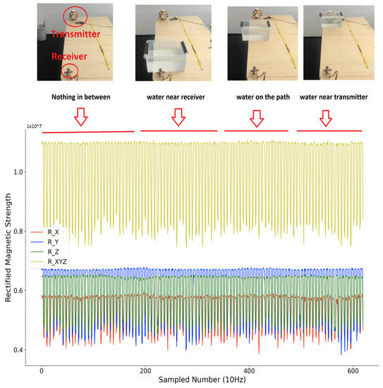 Compared to other beacon-type systems, our system’s key advantage is that it has no RF-like wave propagation, which means no non-negligible reflection, no refraction, etc. exists. Due to the very close relative permeability of water and air (0.99999976 vs. 1.00000037), the submersion of the system in deeper water should not change the field signal’s properties. The signal changes only if within the range of non-negligible magnetic field (which is limited to a few meters because of the decrease and the size of the coils) there is an object in which the magnetic field can induce a current (typically eddy current) losing energy/inducing an opposing field. To experimentally test the influence from the maritime environment on the distribution of the magnetic field strength, we performed a simple test where we put different medium between the transmitter and receiver (near the receiver with less than 1 cm distance, on the path in between with more than 70 cm distance to both transmitter and receiver, near the transmitter with less than 1 cm distance), and observe the rectified strength. The transmitter was configured to a single axis magnetic field generator, with the activation window of 400 ms and a non-activation window of 200 ms. As Figure 14 shows, the sensed raw rectified magnetic field strength was plotted. Their combination was calculated by performing the square root calculations of the sum of square of each axis.