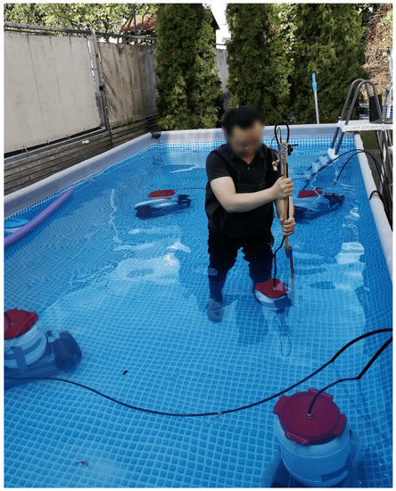 Underwater evaluation experiments in a swimming pool (549 × 274 × 122 cm), where four RS-485 synchronized transmitters were placed at the bottom of the pool.