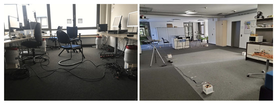 Indoor experiment performed as a baseline to compare with the underwater accuracy. Working office (left, 4 × 4 m), social place (right, 5 × 4 m).