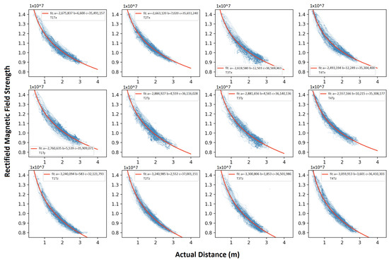 Fitted relationship of each magnetic field rectified strength and actual distance (office experiment).