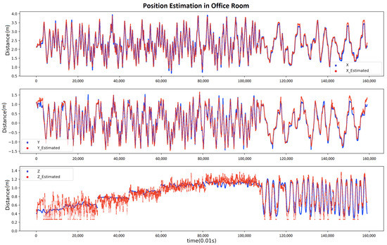 Figure 21 shows the estimation result compared with the actual position in the office room. The ultrasound system supplies the actual position. During the experiment, the volunteer held the receiver system in hand and moved in a planar way in a random direction with different heights for around 1100 s. Then, the volunteer moved the receiver in any direction in 3D space, including varying the vertical height continuously. Figure A3 and Figure A4 show the estimation result compared with the actual position in the social place and underwater, respectively. There is one point to be clarified, during the underwater experiment, the ultrasound system could not provide sufficient Z-axis ground truth; thus, we only recorded the height of the receiver as the ground truth while moving the receiver in a planar way from start to around 3250 s. After the planar data collection, the volunteer moved the receiver randomly in any direction in 3D space continuously (as the end part of Figure A4 depicts). As the height information couldn’t be recorded during this period, we did not consider data from this period while evaluating the estimation performance.