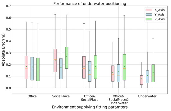 The positioning result in the underwater environment shows competitive positioning accuracy, around 0.133 m in 2D (x-y-plane) and 0.190 m in 3D (x-y-z-space). To test the generality of the system’s positioning performance in a different environment, we did cross-estimation to observe the performance, namely, abstracting the fitting parameters from data collected in other environments and then calculate the estimated positioning with the data from the to-be-evaluated environment. Table 3 lists the cross-estimation result and the combine-estimation result where all data was combined to abstract the fitting parameters. Compared with Table 2, the cross-evaluated positioning accuracy drops when using parameters abstracted from other environments. However, the results also show that a set of robust and general fitting parameters could be obtained with more data. As Figure 22 depicts, the underwater positioning with the office and social place data as a base could still get the mean absolute error less than 20 cm in each space axis. When combining all collected data to abstract the fitting parameters, the evaluated positioning result is competitive to the best evaluation result when abstracting the fitting parameters from the locally collected data only. This means that our system does not need to collect data for fitting parameter abstraction whenever the system is deployed to a new environment. In other words, the system can provide a plug-and-play positioning service when the positioning accuracy demand does not exceed 20 cm.