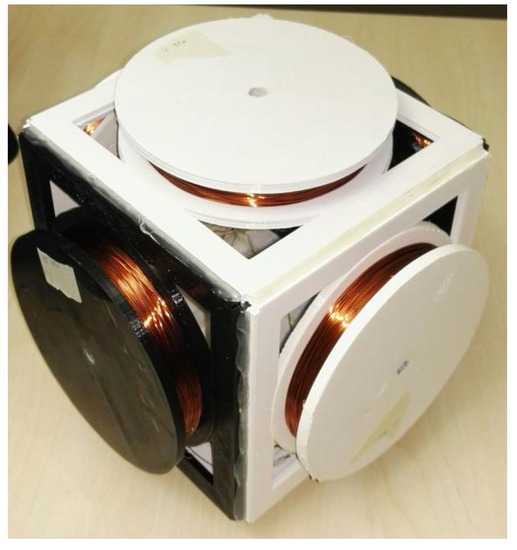 The same designing method was also applied to the receiver coil, as Figure 5 depicts. The receiver coils were also designed in a cube form and composed of coils in three axes with two serially connected inductors in each axis. The inductance of each axis of the receiver coils is 6.6 mH. A similar coupled oscillating circuit is then tuned to sense the magnetic field strength nearby.