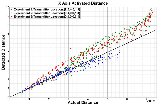 As data from both the ultra-sound router and receiver Bluetooth were transferred to the computer, we assigned the timestamp to the data to synchronize the ground-truth to each magnetic field’s strength information. In the four transmitters configuration, we assigned each transmitter a 55 ms time window, which means a 4.55 Hz update rate of strength for each transmitter. Within the time window, for the RS485 synchronization approach, each axis was activated for 6 ms. The interval between the axis’s activation window was 3 ms or 6 ms, depending on the transmitter ID. For the Zigbee synchronization approach, each axis was activated for 10 ms successively with 5 ms gap time and then listened to the next “start” order. The ground-truth data were supplied with an update rate of 8 Hz. We interpolated both ultrasound and magnetic fields’ time-series data to an array with 100 Hz sample rate. Then, we were able to get the relationship of rectified magnetic field strength generated by each axis of the transmitter and the practical distance, as Figure 20 depicts. The practical distance was received by calculating the Euclidean distance between the receiver coordinates and the corresponding transmitter coordinates. Considering the actual strength–distance relation (Equation (1)) and the signal processing unit on the receiver board (Butterworth filter and logarithmic amplifier), we used a curve-fitting method to describe the relation of rectified strength and actual distance with