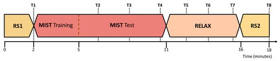 Figure 1. Time flow of the experimental session. First, the participants completed a two-minute eyes-closed resting state period (RS1). This process was repeated at the last stage of the experimental procedure (RS2). Then, the participants were stressed through a test designed to induce psychological stress by means of arithmetical operations (MIST). Finally, they relaxed through a 360-degree virtual experience (RELAX) for 5 min. The experimental procedure lasted about 18 min. During the session, we performed multiple surveys to gather the self-perceived level of stress of the participants (T1–T8). MIST: Montreal imaging stress task.