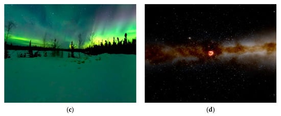 Figure 2. In-game view screenshots of the different 360-degree scenarios. (a) Beach. (b) Cascade cave. (c) Aurora Borealis. (d) Space.