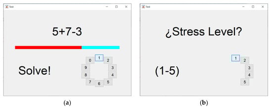 With respect to the MIST, we implemented this test as a graphical interface using MATLAB R2016a (MathWorks). The test consisted of a series of arithmetical operations based on combinations of additions, subtractions, multiplications, and divisions. First, the participants completed a three-minute training phase with no time limit to solve each operation. Then, they performed a six-minute test phase, with a time limit to complete each operation. The MIST interface displayed the time limit as a progress bar over each operation. Moreover, the interface also showed the accumulated success rate of the participant as a second progress bar. The success rate was intentionally displayed to induce pressure on the participant. Additionally, the technician in charge of the experiment entered the room to verbally put pressure on the participants on three occasions during the test phase. Likewise, we integrated three SPSL surveys into the MIST interface so the participants could report their self-perceived level of stress during the test phase (see Figure 3). To complete the MIST, we instructed the participants to remain seated and to use the touchscreen of the laptop with their dominant hand to solve the operations. The MIST had a duration of 9 min, including the train and the test phase.
