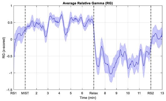 Figure 4. Evolution of the average relative gamma (RG) during the experiment. To obtain the average, the RG from the participants whose response was inversely proportional to the stress level felt was inverted before averaging. RS1 and RS2 indicate the start of the resting state periods. MIST corresponds to the beginning of the stress session (only the six-minute test phase). Relax refers to the start of the relaxation phase. The shaded area corresponds to the standard error of the mean (SEM).