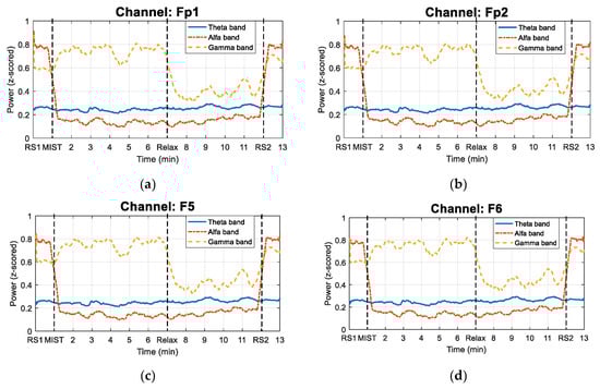 Figure 5. Power changes in Theta, Alpha and Gamma bands for each of the four electrodes considered in the study for subject S02. The solid line represents the power evolution in the Theta band. The dash-dotted line indicates the time evolution of the power in Alpha band. The dashed line corresponds to the power changes in Gamma band. (a) Fp1 channel. (b) Fp2 channel. (c) F5 channel. (d) F6 channel.