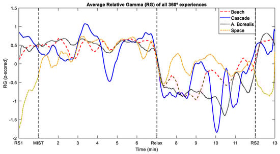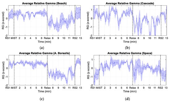 Figure 6. Time evolution of the average relative gamma for the four different 360-degree experiences. The shaded area corresponds to the standard error of the mean (SEM). (a) Beach experience. (b) Cascade cave experience. (c) Aurora Borealis experience. (d) Space experience.