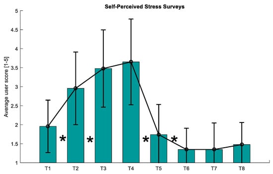 Figure 8. Average of the SPSL answers given by the participants. Vertical black lines indicate the standard deviation of the mean. The asterisks (*) indicate statistically significant differences (p-value < 0.05) between T1–T2, T2–T3, T4–T5, and T5-T6. SPSL: self-perceived stress level.