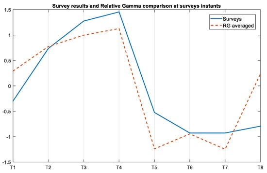 Figure 9. Normalized average of the SPSL answers and the average RG across participants at the eight survey instants. We computed the RG values as the mean of the RG curve in the minute that preceded each survey.